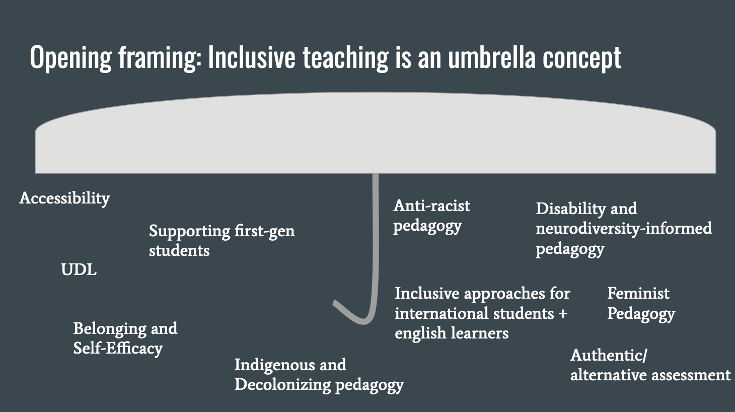 I use the image above when giving presentations to faculty that relate to the expansive concept of “inclusive teaching.” It has helped me a lot as a teacher and faculty developer to acknowledge that “inclusive teaching” is really an umbrella concept rather than one single teaching approach. It is a good idea to acknowledge this complexity, the fact that ideas under this umbrella can definitely support one another but can also have friction with one another, and that it is useful to be specific about what is meant by “inclusive teaching” in any given context. There is definitely more under this umbrella than I was able to put on the slide – these are just examples!